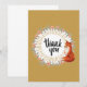 Illustration à l'aquarelle d'un renard assis et d'une délicate couronne florale avec des fleurs de couleur pêche et des feuilles grises sur un fond brun doré. Texte central « merci ».