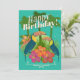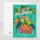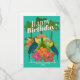 Turquoise Arrière - plan fun unisex Happy Birthday Card avec un thème tropical incluant palmiers, oiseaux toucans, fleurs d'hibiscus, feuilles de palmiers, et autres couleurs et illustrations tropicales.