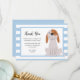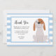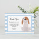 Carte de remerciements mignonne pour la fête d'anniversaire du chiot de votre enfant. Tout le texte est modifiable. Le texte dit "Merci d'être venu à ma fête d'anniversaire PAWSOME. J'ai adoré votre cadeau et je me suis tellement amusé à vous avoir à la fête ! votre ami, Oliver." Il y a une jolie illustration de chiot à côté du texte et il y a des rayures bleues et blanches dans l'arrière - plan.