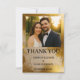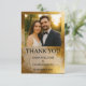 Montrez votre profonde gratitude dans le style avec cet élégant carte de remerciements mariage en feuille d'or. Avec une photo personnalisée sur le devant et un message de remerciement chaleureux sur le dos, cette carte est parfaite pour les couples qui veulent chérir leur journée spéciale avec des proches. Idéal pour les mariages, les réceptions ou les fêtes post-nuptiales. Personnalisable avec vos noms, date et message pour le rendre vraiment unique. Un design élégant et intemporel pour les jeunes mariés modernes.