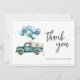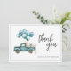 Carte de remerciements de bébé bleu foncé avec un camion vintage bleu aquarelle avec ballons.