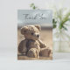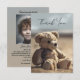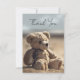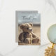 Carte de remerciements photo commémoratif ou funéraire plein de coeur avec un ours en peluche sur la plage. Sur le dos, vous pouvez ajouter votre photo personnalisée (en option) sur un arrière - plan bleu/sable doux. Une façon réfléchie de dire Merci à ceux qui ont assisté aux funérailles ou aux cérémonies commémoratives d'un être cher ou qui ont offert leur soutien de toute autre manière. L'image de l'ours rend cette carte particulièrement adaptée à une situation où un enfant a été perdu.