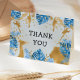 Ce safari "sauvage" à thème de la fête du premier anniversaire du garçon avec des animaux à fausse feuille d'or (girafe, lion et singes), le feuillage de la jungle dorée et bleue, et un arrosage de confettis d'or sur un arrière - plan bleu pâle. Les mots "Merci" apparaissent sur le devant ; personnalisent le message à l'intérieur, ou effacent pour écrire des notes individuelles aux invités.