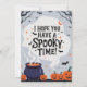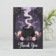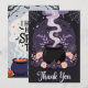 Cette charmante carte de remerciement à thème Halloween présente un mélange captivant d'éléments éffrayants et élégants. Le design avant présente un mystique chaudron noir entouré de magnifiques fleurs violettes foncées et roses douces, émettant un tourbillon de fumée magique. Des détails délicats comme un petit citrouille, des toiles de coiffure et des chauves-souris apportent un charme subtil à Halloween, tandis que le texte gracieux "Merci" dans un script élégant ajoute une touche personnelle.