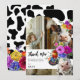 Carte de remerciement d'anniversaire à thème vache sacrée. Le design présente un fond à imprimé vache noir et blanc, une arche de photo blanche, deux vaches mignonnes avec des couronnes de fleurs aquarelles vives et audacieuses et un message de remerciement amusant.