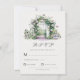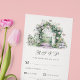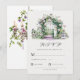 Cette carte mariage RSVP est dotée d'un arc de jardin fleuri avec une fontaine d'eau sur un arrière - plan blanc et d'une typographie personnalisable.