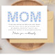 Une carte magnifiquement conçue avec une élégante typographie florale qui épelle "MOM" avec grâce. Des fleurs délicates et des couleurs douces créent un look intemporel et chaleureux qui lui donne l'impression d'être spécial. Personnalisée juste pour elle, c’est plus qu’une carte, c’est un souvenir de votre amour.