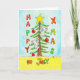 Cette jolie carte postale, dessinée à la main dans un style de dessin animé et colorée en aquarelles, montre deux petits ours koala accrochés à un arbre de noël orné de trois billes rouges et d'une grande étoile jaune. Sur le côté gauche de l'arbre, vous pouvez lire le mot "Heureux" écrit verticalement dans les tons vert, rouge et orange. Sur la droite le mot "Noël", épelé "Noël", et au bas de la carte "en juillet.", tous colorés dans le même style. Le sol sur lequel repose l'arbre est jaune coloré. L'arrière - plan est bleu clair. Là, des flocons de neige se dispersent ici et là, allongés sur les branches d'arbres et recouvrant le sol. Aucun ours-gouttes n'a été sollicité pour la confection de cette carte.