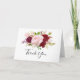 Cette carte de remerciements mariage rouge tropicale et romantique conviendra parfaitement à un mariage simple. Le design artistique bordo marsala présente des roses d'aquarelle, verts, roses, bordeaux et roux assortis de verdure bien disposés dans un bouquet de fleurs gracieux et radieux.