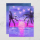 Purple Beach Sunset Anniversaire Invitations. Invitations vibrantes et audacieuses conçues avec un beau coucher de soleil rose, bleu et violet, des palmiers et des accents de fil clair. Cette invitation au coucher du soleil en sweet sixteen sera une introduction fabuleuse à votre journée spéciale.