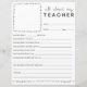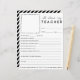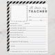 Un cadeau amusant pour remercier un enseignant à la fin de l'année scolaire. C'est tout sur mon enseignant remplir la lettre vide avec de l'espace pour que votre enfant écrive à la main et une boîte à flèche vide pour écrire ou dessiner quelque chose dans. Le dos de ce cadeau de lettre d'enseignant est rayé blanc et noir. Cela ferait un joli gardien de professeur. Veuillez jeter un oeil à ma collection de cadeaux pour enseignants pour plus d'idées.