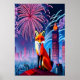 Un renard rouge assis sur le toit de la ville des insectes avec feu d'artifice sur la ville au Nouvel An dans l'arrière - plan. C'est un art généré par l'IA.