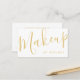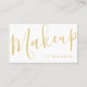 Faites de votre entreprise un carte de visite de rendez-vous d'artiste de maquillage blanc et d'or d'écriture moderne. Cette carte de rendez-vous comporte le mot "maquillage" en style de police de calligraphie moderne dorée sur le côté avant avec des détails en style de police sans serif moderne doré sur le côté arrière. Parfait pour les maquilleurs, les salons de beauté, les cosmétologistes et beaucoup d'autres professions. Remarque : Les détails du papier sont simulés dans l'illustration. Il n'y aura pas de métal sur ce produit.