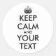 Faites customiser les autocollants calmes ronds avec ce modèle. Il a le logo de couronne calme en noir et les mots en lettres noires. Il dit Conserver le calme et votre texte. Ajoutez vos propres mots dans le modèle pour créer votre propre dire de rester calme. Vous pouvez modifier le style ou la couleur de la police pour customiser. Ou ajoutez une couleur arrière - plan. Vous pouvez changer le dicton pour correspondre à n'importe quelle occasion ou événement. Par exemple, Gardez le calme et rêvez. Assurez-vous que votre texte s'insère dans la zone de sécurité. Vous pouvez les personnaliser et les utiliser comme faveurs de fête, de mariage ou de douche. Ou les donner en cadeau, en empochant des peluches, ou les mettre sur des enveloppes. Les enfants adorent aussi les autocollants. Trouver plus personnalisable garder des modèles calmes pour les affiches, chemises et autres articles, à Keep Calm et Your.