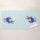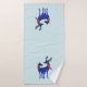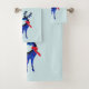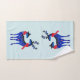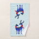 Serviettes de bain avec un fond bleu verdâtre clair. Illustré avec une paire de cerfs scandinaves bleus portant des écharpes rouges. Marquages décoratifs sur leurs corps.