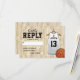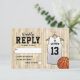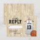 Cartes de réponse de fête de bar mitzvah avec un arrière-plan de terrain de basketball, un maillot blanc avec le nom de votre enfant, le numéro, l'étoile de David, et un modèle de RSVP facile à personnaliser.