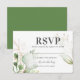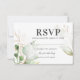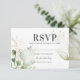 Cartes de réponse de mariage élégantes au eucalyptus avec un fond blanc classique, un affichage moderne à l'aquarelle de feuillage vert forestier, des accents floraux dorés tendance et un modèle de rsvp élégant facile à personnaliser.