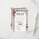 Cartes de réponse de mariage automnal présentant un fond blanc chic et élégant qui peut être changé en n'importe quelle couleur, une composition florale aquarelle rouge burgundy, marsala et blush sur une arche de mariage en bois rustique, un cœur sculpté avec les initiales du couple, et un modèle moderne de RSVP de mariage avec une option de menu.