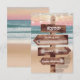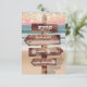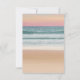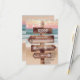 Carte de réponse de mariage océanique romantique avec un coucher de soleil luxuriant, une plage de sable, des lumières scintillantes en fil et votre texte de réponse écrit sur un panneau indicateur en bois rustique.