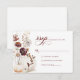 Célébrez votre histoire d'amour avec une touche de charme bohème cet automne ! Nos cartes de réponse présentent des fleurs sauvages rustiques et enchantées à l'aquarelle, des citrouilles charmantes et un modèle de texte élégant qui donne le ton pour votre mariage de rêve. Laissez vos invités tomber amoureux de la saison et de votre événement inoubliable.