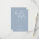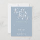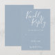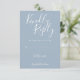 Cette carte de réponse élégante bleu poussiéreux et blanc peut être personnalisée avec une écriture blanche chic. Vous pouvez ajouter des informations supplémentaires telles que le choix du menu au verso. Parfait pour les mariages, les enterrements de vie de jeune fille, les baby showers, les baptêmes, les fêtes de fiançailles, les célébrations d'anniversaire, les remises de diplômes, les anniversaires et autres événements spéciaux tout au long de l'année ! Conçu par Thisisnotme©