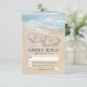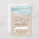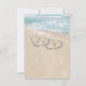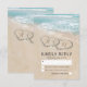 Cartes de réponse pour mariage à destination de plage avec un fond d'île tropicale estivale, une plage de sable vintage avec deux cœurs sur le rivage, vos initiales et un modèle de réponse au mariage.