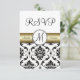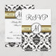 Cartes de réponse RSVP d'invitation de mariage élégantes et sophistiquées vintage noir et blanc avec accent de couleur or que vous pouvez personnaliser. Un beau motif damassé en arrière-plan est accentué par un embellissement circulaire et un monogramme sur une ligne à effet métallisé or contenant les noms des mariés. Les effets Photoshop avec ombres donnent à cette carte un aspect 3D en couches imprimées directement sur le papier de votre choix. Conception de carte de réponse de mariage par Elke Clarke ©2010, 2012. Graphiques sous licence. Une façon élégante de définir le thème de votre mariage. Personnalisez avec vos détails de mariage et les informations de carte de réponse de mariage pour une collection d'invitations de mariage parfaite.