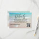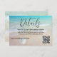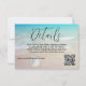 Carte de détails de mariage avec un thème de plage et option de réponse en ligne. Écriture moderne "détails" (ou RSVP) en haut avec un paragraphe de texte imprimé et espace pour l'URL du site web si nécessaire. Inclut un code QR pour que les invités accèdent facilement à un emplacement de réponse, ou vous pouvez supprimer l'image du code dans l'outil de conception - "personnaliser davantage". L'eau bleue tropicale et le sable de la plage constituent l'arrière-plan avec un petit dollar de sable blanc.