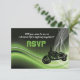 Carte de réponse RSVP de mariage de motard/e de route verte, avec une moto sur un fond dégradé vert abstrait, blanc, noir et une maille blanche. Design élégant et cool parfait pour les motards/es au goût raffiné. Certains éléments fournis par Clipartandfonts.com.