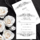 © Socialite Designs Inc. La carte de réponse à l'événement élégante comporte un magnifique design floral noir sur fond blanc. Associez cette carte de réponse RSVP élégante à l'invitation de mariage assortie et à d'autres produits de cette collection de designs.