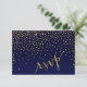 Cette carte de réponse RSVP chic comporte des paillettes scintillantes de confettis carrés dorés qui se déversent sur le corps de cette carte bleu marine. Produits assortis disponibles. Disponible en 6 couleurs : aubergine, marine, turquoise, noir, rose et sable. Cliquez sur le bouton PERSONNALISER pour personnaliser avec votre propre texte. POUR VOIR LA COLLECTION ENTIÈRE, VISITEZ MON SITE WEB : glamprettyweddings.com. Pour les questions ou les demandes personnalisées, envoyez un email : cheryl@glamprettyweddings.com/contact. Conception "Diamonds in the Sky" par Cheryl Daniels © 2014.