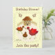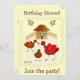 Illustration de 3 poulets jetant un ver dans leur jardin. Derrière se trouve leur mignonne maison à poules avec une clôture. Une piste de pied de poulet=empreintes entoure l'image, et un amas d'oeufs bruns décorent la carte. Customisez votre message à l'avant et à l'intérieur.Intérieur: un autre poulet et une piste d'empreintes de pieds ajoutent du charme à votre invitation.