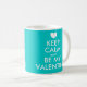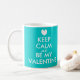Reste calme et sois ma tasse de Saint Valentin. Couleur bleu turquoise. Mignonne Restez calme et continuez la parodie avec peu de coeur. Humour de typographie de la Saint Valentin. Une idée de cadeau amusant pour petit ami ou petite amie amoureuse.