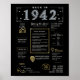 Revenez en 1942 avec notre affiche numérique captivante, remplie d'informations historiques, d'événements remarquables et d'histoires intrigantes d'antan. Doté d'élégantes touches d'or et d'argent collées à un arrière - plan noir audacieux, orné de symboles uniques et de texte élégant, ce poster dégage un charme classique. Qu'il s'agisse de déclencher des conversations lors de rassemblements ou tout simplement d'être présenté comme un gardien chéri, il apporte une nostalgie à n'importe quel espace. L'affiche présente un aperçu de 1942, couvrant des aspects comme le revenu moyen, les inventions populaires, les moments historiques clés, les tendances de la mode et l'argot de l'époque. Il met en évidence des jalons importants tels que la reconstruction d'après-guerre, l'essor de la musique swing et la production de masse de gomme à bulles. Des inventions remarquables comme le four à micro-ondes, le moteur à réaction et le microscope électronique sont également présentées, offrant un aperçu des avancées technologiques de l'époque. Dans l'ensemble, le diagramme saisit l'essence de la vie dans les années 1940, touchant à la technologie, au coût de la vie et à des phénomènes culturels comme la musique swing et la mode de guerre.