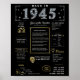 Revenez en 1945 avec notre affiche numérique captivante, remplie de détails historiques, d'événements remarquables et d'histoires intrigantes d'antan. Doté d'élégantes touches d'or et d'argent collées à un arrière - plan noir audacieux, orné de symboles uniques et de texte élégant, ce poster dégage un charme classique. Qu'il s'agisse de déclencher des conversations lors de rassemblements ou tout simplement d'être présenté comme un gardien chéri, il apporte une nostalgie à n'importe quel espace. L'affiche présente un aperçu de 1945, couvrant des aspects comme le revenu moyen, les inventions populaires, les moments historiques clés, les tendances de la mode et l'argot de l'époque. Il met en évidence des jalons importants tels que la reconstruction d'après-guerre, l'essor de la musique swing et la production de masse de gomme à bulles. Des inventions remarquables comme le four à micro-ondes, le moteur à réaction et le microscope électronique sont également présentées, offrant un aperçu des avancées technologiques de l'époque. Dans l'ensemble, le diagramme saisit l'essence de la vie dans les années 1940, touchant à la technologie, au coût de la vie et à des phénomènes culturels comme la musique swing et la mode de guerre.