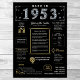 Entrez en 1953 avec notre affiche d'anniversaire numérique attrayante, remplie de faits historiques, d'événements importants et d'histoires intéressantes du passé. Décorée avec des détails dorés et argentés sur un arrière - plan noir audacieux, avec des symboles uniques et un texte élégant, cette affiche d'anniversaire a un charme intemporel. Qu'il s'agisse d'allumer des conversations lors de réunions d'anniversaire ou d'être gardé comme un gardien, il ramène des souvenirs nostalgiques. L'affiche d'anniversaire donne un aperçu de 1953, couvrant des sujets comme le revenu moyen, les inventions populaires, les événements importants, les tendances de la mode, et l'argot de l'époque. Il met en lumière des moments clés tels que la première émission de télévision couleur, le baby-boom d'après-guerre, l'essor du rock and roll, et l'invention du vaccin contre la polio. Des inventions notables comme le photocopieur, la batterie alcaline et la bombe à hydrogène sont également mentionnées, montrant les avancées technologiques de l'époque. Dans l'ensemble, l'affiche d'anniversaire saisit l'essence de la vie dans les années 1950, touchant à la technologie, aux frais de vie et aux tendances culturelles comme la musique et la mode. Il fait une pièce de conversation mémorable lors de fêtes d'anniversaire, anniversaires et un cadeau de souvenir réfléchi lorsqu'il est encadré.