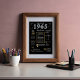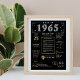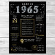 Revenez en 1965 avec notre affiche d'anniversaire numérique captivante, riche de faits historiques, d'événements marquants et d'histoires intrigantes du passé. Ornée d'élégants détails dorés et argentés contre un arrière - plan noir audacieux, avec des symboles uniques et un texte élégant, cette affiche d'anniversaire dégage un charme intemporel. Qu'il s'agisse d'allumer des conversations lors de réunions d'anniversaire ou de se faire chérir comme gardien, il évoque des souvenirs nostalgiques. Notre affiche d'anniversaire donne un aperçu de 1965, explorant des aspects tels que le revenu moyen, les inventions populaires, les événements importants, les tendances de la mode et l'argot de l'époque. Il met en lumière des moments clés tels que l'avènement de la première calculatrice portative, l'atterrissage de la Lune américaine, le mouvement pour les droits civiques et l'approbation de la pilule contraceptive. Des inventions remarquables, comme le premier laser, le stimulateur cardiaque et la valve cardiaque artificielle, sont également présentées, montrant les avancées technologiques de l'époque. Dans l'ensemble, l'affiche d'anniversaire reflète l'essence de la vie dans les années 1960, englobant la technologie, les frais de vie et les tendances culturelles comme la musique et la mode. Il sert de pièce de conversation mémorable lors de fêtes d'anniversaire et d'anniversaires et fait un souvenir réfléchi lorsqu'il est encadré.