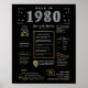 Entrez en 1980 avec notre affiche d'anniversaire numérique captivante, débordant de faits historiques, d'événements importants et de récits captivants du passé. Orné d'élégants accents d'or et d'argent sur fond noir, l'affiche d'anniversaire rayonne d'un charme intemporel. Qu'elle soit fièrement présentée lors de rassemblements d'anniversaire ou chère en souvenir, elle s'engage à déclencher des conversations passionnantes et à évoquer des souvenirs chéris. Notre affiche d'anniversaire offre un aperçu fascinant en 1980, en abordant des aspects tels que le revenu moyen, les inventions notables, les événements importants, les tendances de la mode et les expressions familières de l'époque. Il met en lumière des moments cruciaux comme l'effondrement de l'Union soviétique, le retour de la comète de Halley et l'émergence de la rupture. Des inventions dignes d'intérêt, telles que les ordinateurs personnels, les CD et les coeurs artificiels, sont en vedette, reflétant les remarquables progrès technologiques de l'époque. Dans l'ensemble, l'affiche d'anniversaire saisit l'essence de la vie dans les années 1980, englobant l'innovation technologique, le coût de la vie et des phénomènes culturels comme la musique et la mode. Il sert de point de départ à une conversation mémorable pour les fêtes d'anniversaire et les anniversaires, et lorsqu'il est élégamment encadré, il se transforme en un souvenir chéri.