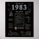Entrez en 1983 avec notre affiche d'anniversaire numérique captivante, débordant de faits historiques, d'événements importants et de récits captivants du passé. Orné d'élégants accents d'or et d'argent sur fond noir, l'affiche d'anniversaire rayonne d'un charme intemporel. Qu'elle soit fièrement présentée lors de rassemblements d'anniversaire ou chère en souvenir, elle s'engage à déclencher des conversations passionnantes et à évoquer des souvenirs chéris. Notre affiche d'anniversaire offre un aperçu fascinant en 1983, en abordant des aspects tels que le revenu moyen, les inventions notables, les événements importants, les tendances de la mode et les expressions familières de l'époque. Il met en lumière des moments cruciaux comme l'effondrement de l'Union soviétique, le retour de la comète de Halley et l'émergence de la rupture. Des inventions dignes d'intérêt, telles que les ordinateurs personnels, les CD et les coeurs artificiels, sont en vedette, reflétant les remarquables progrès technologiques de l'époque. Dans l'ensemble, l'affiche d'anniversaire saisit l'essence de la vie dans les années 1980, englobant l'innovation technologique, le coût de la vie et des phénomènes culturels comme la musique et la mode. Il sert de point de départ à une conversation mémorable pour les fêtes d'anniversaire et les anniversaires, et lorsqu'il est élégamment encadré, il se transforme en un souvenir chéri.