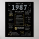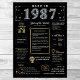 Revenez en 1987 avec notre affiche d'anniversaire numérique captivante, riche de faits historiques, d'événements importants et de récits captivants du passé. Avec ses élégantes touches d'or et d'argent sur fond noir, cette affiche exhale un charme intemporel. Qu'il soit présenté fièrement lors de rassemblements d'anniversaire ou tenu à l'honneur comme un gardien, il promet d'allumer des discussions animées et d'évoquer des souvenirs chéris. Notre affiche d'anniversaire offre un aperçu intrigant de 1987, explorant des facettes telles que le revenu moyen, les inventions notables, les événements importants, les tendances de la mode et les expressions familières de l'époque. Il met en lumière des moments clés comme l'effondrement de l'Union soviétique, le retour de la comète de Halley et la montée du breakdance. Des inventions majeures telles que les ordinateurs personnels, les CD et les coeurs artificiels sont présentées, reflétant les progrès technologiques remarquables de l'époque. Dans l'ensemble, l'affiche de l'anniversaire résume l'essence de la vie dans les années 1980, en saisissant à la fois l'innovation technologique et les phénomènes culturels tels que la musique et la mode. Il sert d'amorce de conversation intéressante pour les célébrations d'anniversaire et les anniversaires, et lorsqu'il est encadré avec goût, il devient un souvenir chéri, préservant l'esprit des temps pour les années à venir.