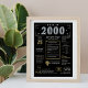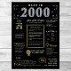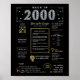 Revenez à l'an 2000 avec notre affiche d'anniversaire numérique captivante, qui regorge de faits historiques, d'événements importants et de récits captivants du passé. Ornée d'élégants accents dorés et argentés sur fond noir, cette affiche d'anniversaire dégage un charme intemporel. Notre affiche d'anniversaire offre un aperçu intrigant en 2000, se penchant sur des aspects tels que le revenu moyen, les inventions notables, les événements importants, les tendances de la mode et les expressions familières de l'époque. Il met en lumière des moments clés comme l'avènement des plateformes de médias sociaux, l'explosion de la télé-réalité, et l'émergence de services de streaming. Des inventions telles que les smartphones, les téléphones portables et les voitures hybrides occupent le devant de la scène, reflétant les progrès technologiques remarquables de l'époque. Dans l'ensemble, l'affiche d'anniversaire saisit l'essence de la vie dans les années 2000, englobant à la fois l'innovation technologique et des phénomènes culturels comme la musique et la mode. Il sert de point de départ captivant pour les célébrations d'anniversaire et les anniversaires, et lorsqu'il est élégamment encadré, il évolue en un souvenir chéri, préservant l'esprit des temps pour les générations à venir.