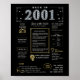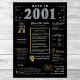 Revenez à 2001 avec notre affiche d'anniversaire numérique captivante, qui regorge de faits historiques, d'événements importants et de récits captivants du passé. Ornée d'élégants accents dorés et argentés sur fond noir, cette affiche d'anniversaire dégage un charme intemporel. Notre affiche d'anniversaire offre un aperçu intrigant en 2001, se penchant sur des aspects tels que le revenu moyen, les inventions notables, les événements importants, les tendances de la mode et les expressions familières de l'époque. Il met en lumière des moments clés comme l'avènement des plateformes de médias sociaux, l'explosion de la télé-réalité, et l'émergence de services de streaming. Des inventions telles que les smartphones, les téléphones portables et les voitures hybrides occupent le devant de la scène, reflétant les progrès technologiques remarquables de l'époque. Dans l'ensemble, l'affiche d'anniversaire saisit l'essence de la vie dans les années 2000, englobant à la fois l'innovation technologique et des phénomènes culturels comme la musique et la mode. Il sert de point de départ captivant pour les célébrations d'anniversaire et les anniversaires, et lorsqu'il est élégamment encadré, il évolue en un souvenir chéri, préservant l'esprit des temps pour les générations à venir.