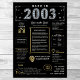 Revenez à 2003 avec notre affiche d'anniversaire numérique captivante, qui regorge de faits historiques, d'événements importants et de récits captivants du passé. Ornée d'élégants accents dorés et argentés sur fond noir, cette affiche d'anniversaire dégage un charme intemporel. Notre affiche d'anniversaire offre un aperçu intrigant en 2003, se penchant sur des aspects tels que le revenu moyen, les inventions notables, les événements importants, les tendances de la mode et les expressions familières de l'époque. Il met en lumière des moments clés comme l'avènement des plateformes de médias sociaux, l'explosion de la télé-réalité, et l'émergence de services de streaming. Des inventions telles que les smartphones, les téléphones portables et les voitures hybrides occupent le devant de la scène, reflétant les progrès technologiques remarquables de l'époque. Dans l'ensemble, l'affiche d'anniversaire saisit l'essence de la vie dans les années 2000, englobant à la fois l'innovation technologique et des phénomènes culturels comme la musique et la mode. Il sert de point de départ captivant pour les célébrations d'anniversaire et les anniversaires, et lorsqu'il est élégamment encadré, il évolue en un souvenir chéri, préservant l'esprit des temps pour les générations à venir.
