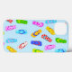 Un étui de téléphone portable avec un motif mignon et branché de tongs colorés et des sandales sur un arrière - plan bleu clair.