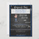 Mic Drop Retraite Party Invitation. Dîner, boissons, hôtel, rsvp. Arrière - plan en bois noir. Police bleue et blanche.