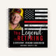 Cette conception comprend un drapeau de pompiers avec des rayures noires et blanches, ainsi qu'une fine bande rouge. Le texte "La légende prend sa retraite" se trouve au-dessus du nom du pompier, lieutenant ou chef qui prend sa retraite. Fêtez dans le style ! Customisez encore plus loin avec une photo du pompier à la retraite.