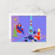Cette Retro Home for the Holidays Postcard ressemble à une scène d'un spécial de Noël télévisé des années 60. Le design minimaliste présente un beau couple de dessins animés dans le salon d'une maison moderne du milieu du siècle. La pièce est bien visible avec un mur en pierre violet et bleu et un tapis rayé violet et bleu assorti. Contre le mur, une cheminée en forme de cône turquoise avec un feu rugissant. Deux bas de Noël rouges et blancs ont été accrochés avec soin par la cheminée mod. Des brins de lumières colorées de Noël sont accrochés au-dessus du mur. Dans le coin, l'homme suave de la maison se dort dans une chaise d'oeuf rouge. Il porte un costume bleu avec une cravate rouge. Il y a une branche de saint épinglé sur son revers. D'un côté, il tient un verre à martini. Pas étonnant qu'il soit si plein d'esprit de Noël ! A côté de lui, il y a un petit arbre de Noël vert avec des ornements turquoises et une étoile jaune. Accroché au plafond, il y a un luminaire Spoutnik jaune. Une blonde avec une silhouette en sablier est assise sur le tapis. Elle porte une robe rouge festive et un chapeau de Père Noël. A côté d'elle, sur le sol, il y a un lecteur portable bleu et noir. Plusieurs albums de Noël sont éparpillés près du magnifique deejay. Vas-y et chante. Tu sais que tu veux !