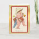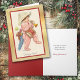 Sur le devant de cette carte de vacances est une jolie image d'art victorien d'un garçon avec son casquette en papier et sa batterie, et célébrant après la visite de Père Noël. L'image est placée sur un arrière - plan doré et encadrée en rouge. Il est facile de customiser ou de personnaliser le message intérieur en fonction de vos goûts. Célébrez Noël de la manière démodée !
