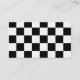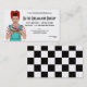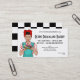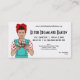 Ce les rétros conceptions inspirées comporte une femme des années 1950 portant une robe rouge et blanche de point de polka avec un tablier turquoise. Ses cheveux bruns bouclés sont enveloppés dans une enveloppe principale rouge assortie. Elle tient un plat des petits gâteaux délicieux et colorés. Cette conception souple a l'abondance du texte et peut être customisée pour n'importe quelles affaires de cuisson. Le revers de cette carte de cru comporte un motif noir et blanc personnalisable de damier.