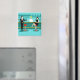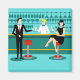 Chaque heure est l'heure heureuse avec ce Retro Cocktail Lounge Magnet. Le design moderne du milieu du siècle présente un dessin animé minimaliste et animé de style années 1960 d'un bar à cocktails élégant. Sur fond de mur d'aqua, on peut voir des rangées de verres de boisson. Au moins, on peut voir les silhouettes turquoises des lunettes de boisson. A en juger par les formes de la tige, ce bar est bien équipé pour mouiller votre sifflet, quelle que soit votre préférence de boisson. Un barman des plus compétents et personnalisables est le bar turquoise aux accents jaunes. Le jeune bardonte porte une chemise blanche immaculée avec cravate arc noir. Son apparence fraîche, ses cheveux blonds et ses lunettes noires de hipster nous donnent toutes les raisons de croire qu'il passe ses journées en tant qu'acteur en difficulté ou en tant que super-héros. D'un côté, le beau mixologiste donne un martini à un client de l'autre côté du bar. Le client en attente est un gentleman à larges épaules en costume noir et cravate rouge. C'est le genre de gars qui est décrit comme grand, sombre et beau même quand il reste des heures jusqu'à la fermeture. Il semble y avoir un tabouret rouge et chrome avec le nom de M. Debonair dessus. Mais pour ne pas être présomptueux, il pose la question : "Pardonnez-moi. Est-ce que ce siège est pris ?" Il demande à la fille aux cheveux raven sur le tabouret du bar voisin. C'est une vraie "fille d'à côté", si vous vivez à côté d'une beauté impeccable avec un personnage qui ne démissionnera pas. Elle porte une robe noire et tient un martini d'une main. Elle espère qu'elle et l'homme approchant ont plus en commun que leur préférence pour la boisson et le choix de la couleur de l'armoire. On dirait que ce soir est devenu intéressant. Bravo !